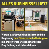 Weder die Elternverbände noch die Lehrergewerkschaften fordern, dass die Fenster in den Klassenräumen geschlossen bleiben sollen. Vielmehr werden Luftreiniger flächendeckend als Ergänzung zur Lüftung gefordert, um einen maximalen Schutz vor virenbehafteten Aerosolen in der Raum- und Atemluft der Klassenräume zu etablieren. Dass Luftreiniger dies leisten können, stellt selbst das Umweltbundesamt nicht infrage. Immerhin empfiehlt das Umweltbundesamt selbst den Einsatz geeigneter Geräte, wenn sich ein Klassenraum nur schlecht oder nicht mit offenen Fenstern belüften lässt.