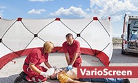 Statt bei einem Unfall darauf warten zu müssen, bis endlich von einer der zwölf Autobahnmeistereien eine Sichtschutzwand angefahren wird, hätten mit dem VarioScreen ausgerüstete Rettungskräfte binnen Sekunden nach ihrem Eintreffen am Unfallort einen stabilen Sichtschutz errichten können. Denn das Fiberglasgestänge ist bereits in den Seitenteilen der Schutzwand integriert – es muss nur noch aufgespannt und gestrafft werden. Und mittels der extra-stabilen Reißverschlüssen können beliebig viele VarioScreen-Elemente miteinander verbunden werden, so dass der Sichtschutz quasi bis ins Unendliche verlängerbar ist.