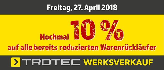 Auf alle bereits reduzierten Warenrückläufer und Gebrauchtgeräte gibt es nochmal 10% Rabatt. Alles in original Trotec Markenqualität! Direkt vom Hersteller und inklusive bester Beratung — was will man mehr?