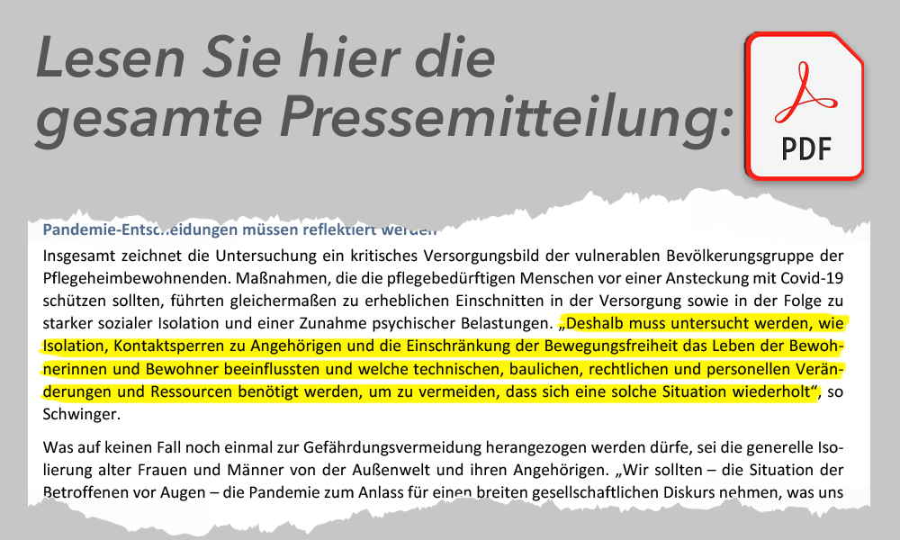 „Die Infektionsschutzmaßnahmen während der Pandemie reichten nicht aus, um die im Heim lebenden pflegebedürftigen Menschen ausreichend zu schützen“, sagt Dr. Antje Schwinger, Leiterin des Forschungsbereichs Pflege im WIdO und Mitherausgeberin des Pflege-Reports. Diese grundlegende Erkenntnis müsse für zukünftige Pandemiekonzepte ebenso berücksichtigt werden wie die deutlichen gesundheitlichen Folgen für die Pflegebedürftigen, insbesondere auch die psychischen Belastungen durch die Isolation, fordert die WIdO in ihrer am 29. Juni 2021 veröffentlichen Studie. Hygienemaßnahmen, die zum Schutz der pflegebedürftigen Menschen in den Heimen umgesetzt wurden, hätten vielfach zu einer Vereinsamung und der Zunahme psychischer Belastungen geführt. „Deshalb muss untersucht werden, wie Isolation, Kontaktsperren zu Angehörigen und die Einschränkung der Bewegungsfreiheit das Leben der Bewohnerinnen und Bewohner beeinflussten und welche technischen, baulichen, rechtlichen und personellen Veränderungen und Ressourcen benötigt werden, um zu vermeiden, dass sich eine solche Situation wiederholt“, so Schwinger.