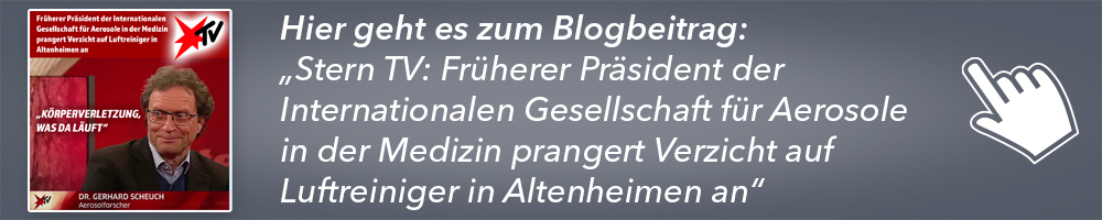 Dr. Gerhard Scheuch, ehemaliger Präsident der ISAM (International Society for Aerosols in Medicine), findet drastischere Worte. Der Aerosolexperte hat schon frühzeitig auf die Übertragbarkeit des Coronavirus durch Aerosole hingewiesen. Er fordert den Einsatz von mobilen Luftreinigern in Alten- und Pflegeheimen. Die Situation in Alten- und Pflegeheimen bezeichnete der Wissenschaftler in einer Stern TV-Sendung als „Körperverletzung, was da läuft“ – da oftmals trotz wissenschaftlich bewiesener Wirksamkeit keine mobilen Raumluftfilter in den Wohnheimen installiert seien.