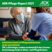 Das Pflegewohnheim Karolinenheim Lage schützt die Bewohnerinnen und Bewohner mit TAC V+ Hochleistungsluftreinigern vor einer Ansteckung mit dem Coronavirus. Warum mobile Luftreiniger zum Infektionsschutz in der Corona-Pandemie unverzichtbar sind, macht der Pflege-Report 2021 des AOK-Bundesverbandes deutlich.