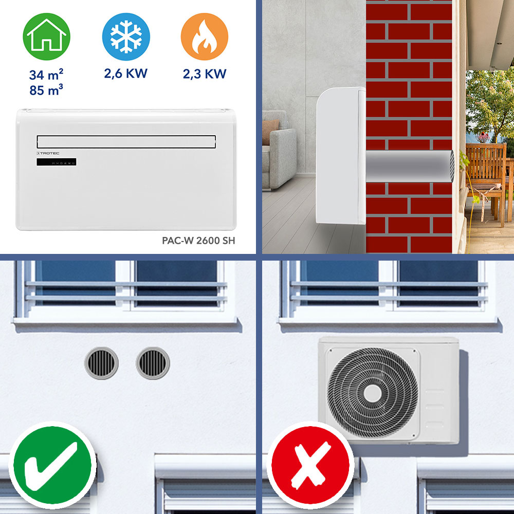 Das optisch ansprechende Monoblock-Klimagerät vereint die gesamte Heiz- und Kühltechnik wie Kompressor, Verdampfer, Steuerung usw. in einem kompakten Innengerät. Kein störendes Außengerät, das zumeist nur mit großem Aufwand durch Fachfirmen montiert werden muss. An der Außenseite des Befestigungsortes sind lediglich zwei Blenden erforderlich, um die notwendigen Luftein- und auslässe abzudecken. Das macht die DIY-Montage des Gerätes besonders einfach. Das Klima-/Heizgerät PAC-W 2600 SH wird stecker- und montagefertig geliefert.