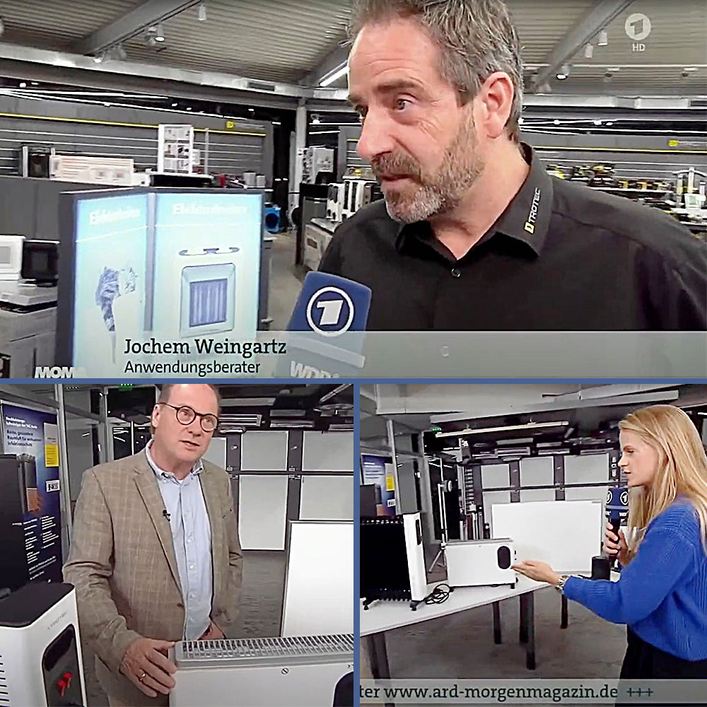 Ob stromsparende Klimaanlagen mit Luft-Wärmepumpe, Infrarotheizstrahler, Konvektorheizgeräte, Warmluftheizer, Steckdosen-Heizlüfter oder Infrarotheizplatten – was Wärme verströmt und die Wohnung bzw. das Eigenheim auf angenehme Raumtemperaturen erwärmt, ist im Heinsberger Trotec STORE oder auch online im Trotec-Onlineshop zu unschlagbar günstigen Preisen erhältlich. Kein Wunder also, dass sich das ARD-Morgenmagazin in den frühen Morgenstunden im Heinsberger Trotec STORE eingefunden hat, um die Zuschauer über die Vor- und Nachteile der verschiedenen elektrischen Heizalternativen zu informieren.