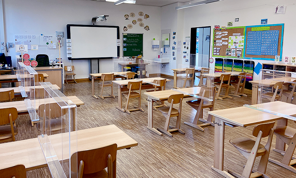 1. Trennwände mit Aerosol-Schutzkante machen das Tragen von Masken überflüssig. Transparente Schutzwände zwischen den Sitzplätzen verhindern, dass sich die Schüler durch umherfliegende Tröpfchen oder bei der Atmung freigesetzte Aerosole des direkten Tischnachbarn mit dem Covid-19-Erreger infizieren. Die glasklaren Trennwände mit Aerosol-Schutzkante bieten einen zuverlässigen Schutz vor größeren Tröpfchen und verhindern zudem, dass die von den Schülern ausgeatmeten Aerosole die Trennwand überwinden und zum Sitznachbarn schweben. Das Tragen einer Maske ist nicht mehr erforderlich. Lediglich beim Verlassen des Platzes muss eine Maske getragen werden.