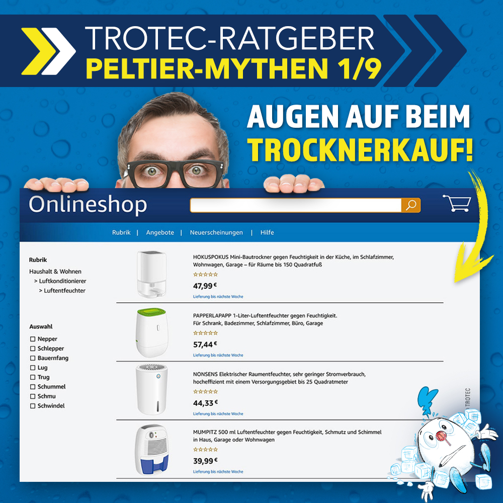 Überschwemmungen, vollgelaufene Keller, Wasser in der Garage: Die Unwetterkatastrophe hat in großen Teilen Deutschlands starke Sturm- und Wasserschäden angerichtet. Nach dem Unwetter geht es nun an die Beseitigung der Schäden. Tauchpumpen, Heizgeräte und insbesondere Luftentfeuchter boomen aktuell in den Baumärkten und Onlineshops. Die hohe Nachfrage nach Luftentfeuchtern mit leistungsstarker Kompressortechnik hat aber auch zahlreiche unseriöse Angebote auf den Markt „gespült“. Not macht erfinderisch! Wer kein passendes Trocknungsgerät zur Schimmelvorsorge im Angebot hat, erklärt kurzerhand ungeeignete Geräte zur Wunderwaffe gegen zu hohe Luftfeuchtigkeit.