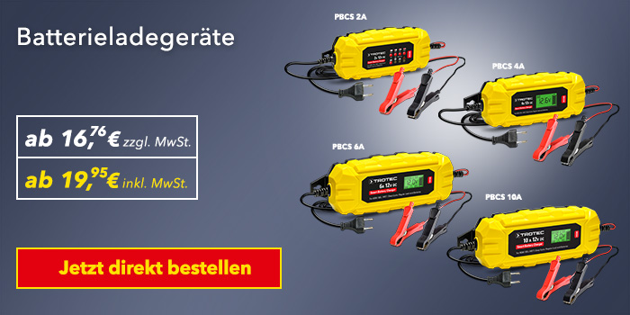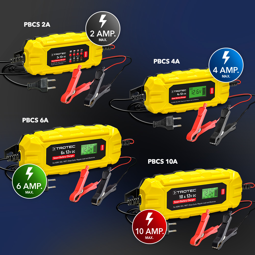 Die PBSC-Batterieladegeräte von Trotec sind in verschiedenen Ausführungen für Batteriegrößen von 4 Ah bis 180 Ah erhältlich.