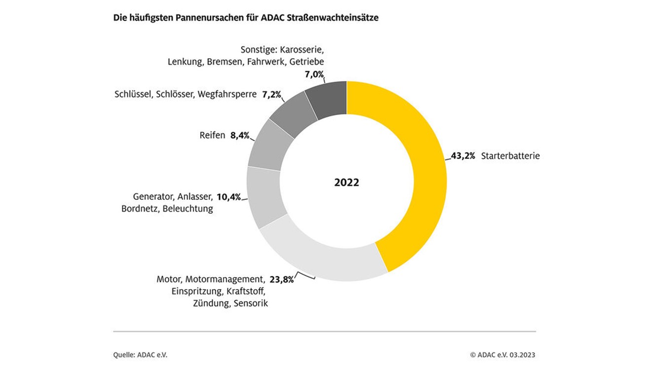 Hätten Sie’s gewusst? Laut ADAC-Pannenstatistik sind Probleme mit defekten oder schwächelnden Starterbatterien nach wie vor die häufigste Pannenursache. Im vergangenen Jahr mussten die Pannenengel bei mehr als 42 Prozent ihrer Einsätze Fahrzeugen mit Batterieproblemen helfen.