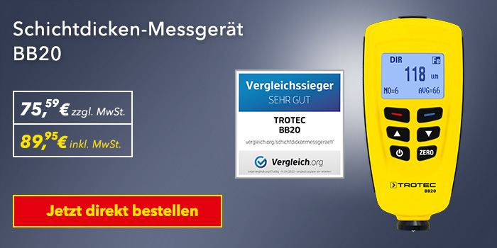 Natürlich ist ein nachlackiertes Auto nicht automatisch ein schlechteres Auto. Aber Vorschäden am Fahrzeug sind bei Verkaufsverhandlungen immer ein gutes Argument, um den Verkaufspreis zu drücken. Da machen sich die 89,95 € für das Schichtdicken-Messgerät BB20 im Handumdrehen bezahlt.