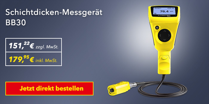 Wer häufiger Gebrauchtfahrzeuge kauft oder gewerblich mit Fahrzeugen handelt, für den rechnet sich das Schichtdicken-Messgerät BB30 mit App-Steuerung zum Preis von nur 179,95 €. Ausgestattet mit einer Vielzahl an Profifunktion und der herausragenden MultiMeasure Mobile App lässt das BB30 bei der regelmäßigen Prüfung von Fahrzeuglacken keine Wünsche offen.