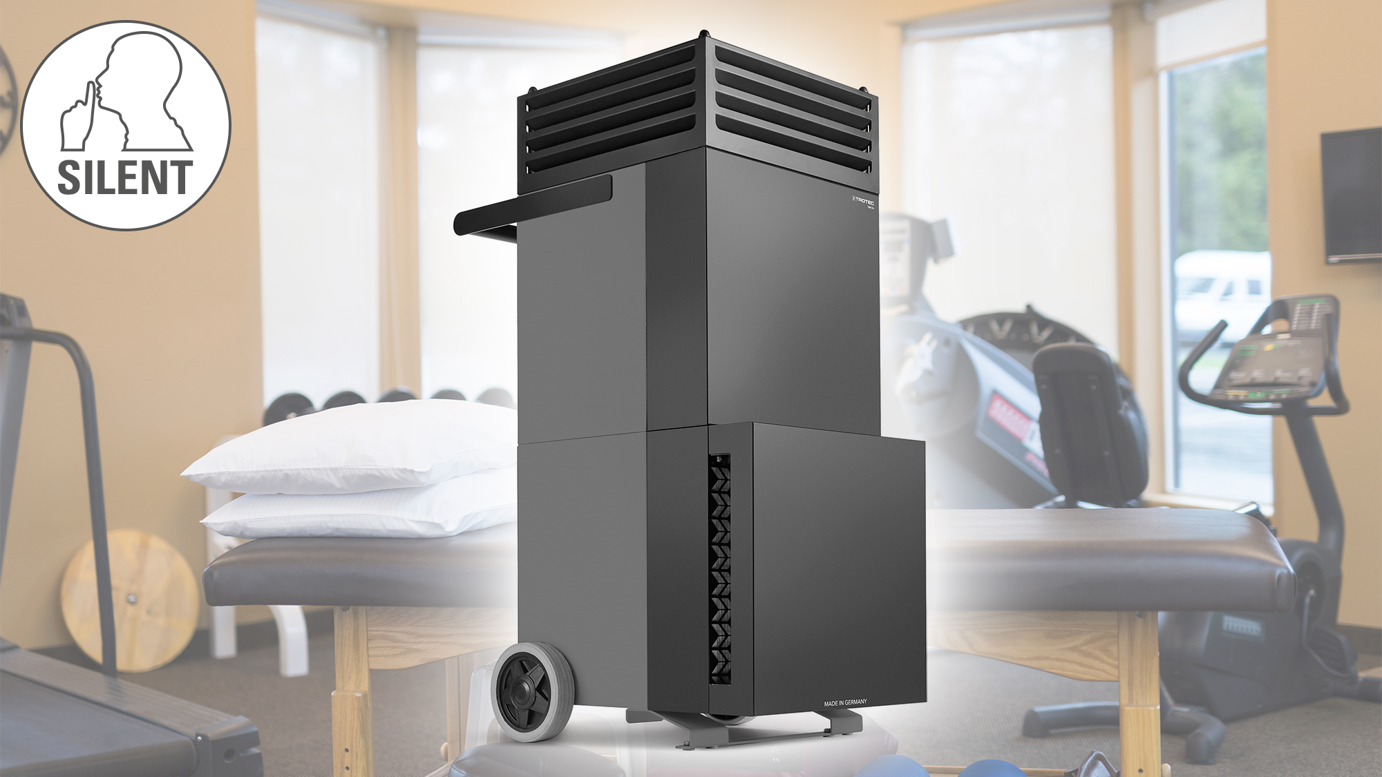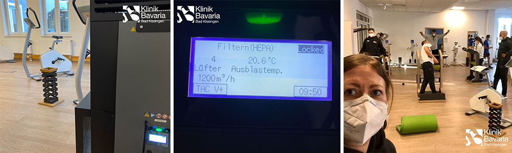 Um das indirekte Risiko einer Ansteckung mit dem Covid-19-Erreger SARS-CoV-2 innerhalb der Bad Kissinger Klinik zu minimieren, wurden die Behandlungs- und Therapieräume mit TAC V+ Hochleistungsluftreinigern ausgestattet. Insbesondere während der Gruppentherapien ist eine hygienisch einwandfreie Raumluft von zentraler Bedeutung. Während größere respiratorische Tröpfchen, die bei körperlicher Anstrengung mit der Atmung ausgeworfen werden, schnell zu Boden sinken, können potentiell virenbehaftete Aerosole über längere Zeit in der Luft schweben und sich in geschlossenen Räumen verteilen. Je mehr Kursteilnehmer gemeinsam trainieren, desto mehr steigt die Aerosolkonzentration im Raum an.