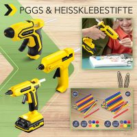 inklusive 1 x 20 V 2 Ah Li-Ion-Akku, 1 x Schnellladegerät, 3 x transparente Klebesticks (Ø 11 mm, Länge: 150 mm) sowie praktischem Transportkoffer. - 50 Heißklebestifte Bunt, in Blau, Rot, Orange, Gelb, Grün (jeweils 10 Stück)
