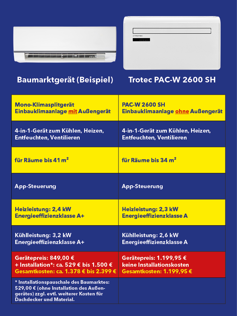 Zum Vergleich: Ein Mono-Klimasplitgerät (Innen- und Außengerät) zum Kühlen, Heizen, Entfeuchten und Ventilieren mit Wärmepumpentechnik kostet bei einer großen Baumarkt-Kette 849,00 €. Das kompakte Wandklimagerät PAC W 2600 SH ohne Außengerät kostet im Trotec Online-Shop 1.199,95 €.
