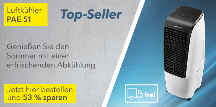 Der Aircooler PAE 51 gehört zu unseren absoluten Kundenlieblingen. Weil er auf Knopfdruck eine angenehme Sofort-Abkühlung verschafft, er heiß gelaufene Wohn- und Büroräume zu wohltemperierten Klima-Oasen macht und das mit natürlicher Verdunstungskälte bewirkt. Natürlich trägt auch die komfortable 4-in-1-Technologie mit Luftkühlung, Ventilation, Lufterfrischung und Luftbefeuchtung zu seiner extremen Beliebtheit hinzu. Doch zu dem aktuellen Angebotspreis wird sich unser Lagerbestand noch einmal blitzschnell lichten. Deshalb unser Rat: Greifen Sie zu. Schnell!