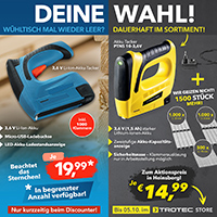 Beim Discounter in begrenzter Anzahl verfügbar, bei uns dauerhaft „zum Bestpreis“ im Sortiment! Während viele Discounter ihre Angebote für begrenzte Zeit anbieten, gibt es bei uns eine große Auswahl an Elektrowerkzeugen zum einmaligen Preis-Leistungs-Verhältnis! Wer uns im STORE in Heinsberg besucht, erhält den Akku-Tacker PTNS 10‑3,6V bis Sa., 05.10. zum Aktionspreis von nur 14,99 €. Aber auch der reguläre Preis von nur 19,94 € in unserem Online-Shop ist verlockend, denn bei uns bekommen Sie noch mehr Zubehör.