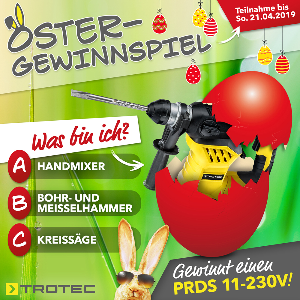 ?Bald ist Ostern und der Frühling ist nicht mehr aufzuhalten. Auf Facebook und Instagram veranstalten wir dazu jeweils ein Gewinnspiel! Mit ein bisschen Glück können Sie eines unserer Kraftpakete gewinnen: Auf beiden Seiten verlosen wir einen Bohr- und Meißelhammer PRDS 11-230V! Damit Sie bestens für den Frühling ausgestattet sind und endlich mal wieder selbst anpacken, gutes Wetter ausnutzen und über den Winter angefallene Arbeiten erledigen können.