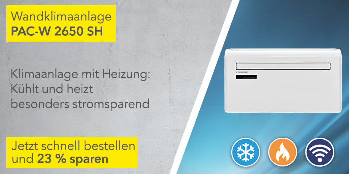 Profitieren Sie von der Trotec-Markenqualität als Garant für hohe Wertigkeit, Sicherheit und Funktionalität. Bestellen Sie am besten noch heute die Wandklimaanlage PAC-W 2650 SH zu unserem aktuellen Angebotspreis statt für 1.699,95 € für nur 1.299,95 € inkl. MwSt. – jetzt im Trotec-Shop!