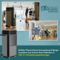 Für Physiotherapie-Praxen gelten beim Gesundheitsschutz der Patienten ebenso hohe Anforderungen wie für Arztpraxen und andere Heilberufe. Daher hat sich die Praxis Sonnenberg & Berger für den Hochleistungsluftreiniger TAC V+ von Trotec entschieden, da nur dieses Gerät wissenschaftlich bewiesen die Gefahr der indirekten Corona-Infektion in Innenräumen senkt. Ergänzend zu Mund-Nasen-Masken, Plexiglasscheiben und Abstandsregeln. Als Entscheidungshilfe diente den Praxisbetreibern die Empfehlung der Universität der Bundeswehr München.