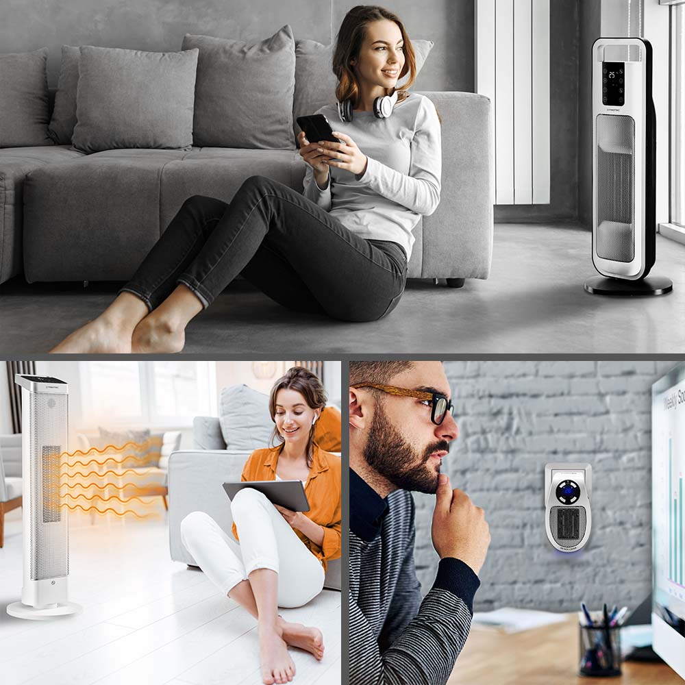 Heiztechnik: Erzeugt wird die Wärme durch innenliegende Heizdrähte. Ein Ventilator saugt die Raumluft an, leitet diese an den Heizdrähten vorbei und bläst die erwärmte Luft zurück in den Raum. Komfortgeräte wie der Keramik-Heizlüfter TFC 20 E im Turmdesign verfügen zudem über eine zuschaltbare Oszillationsfunktion. Dabei dreht sich das Gehäuse des Heizgerätes vertikal um 80° und verteilt so die Warmluft großflächig im gesamten Raum.