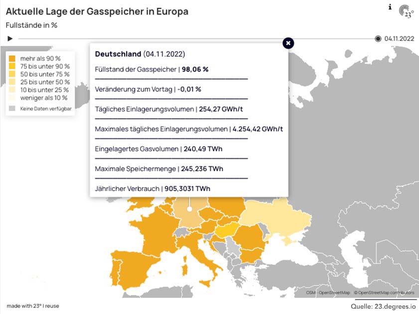 „Wir haben viel Gas gespeichert, aber der Winter kann Iange dauern.“, warnt Klaus Müller, Präsident der Bundesnetzagentur für Digitalisierung, Klimaneutralität & Resilienz auf Twitter. Wie lange die Speicher für die Versorgung des deutschen Gasbedarfs reichen, sei stark temperaturabhängig. „Sollte es im Winter sehr kalt werden, dann werden sich die Speicher auch sehr schnell wieder leeren.“ Bereits wenige klirrend kalte Tage seien ausreichend, um den Gasverbrauch dramatisch ansteigen zu lassen, sagte Müller gegenüber dem Nachrichtenmagazin „Spiegel“. „Wenn es richtig frostig wird, werden die Speicher schnell leergesaugt.“