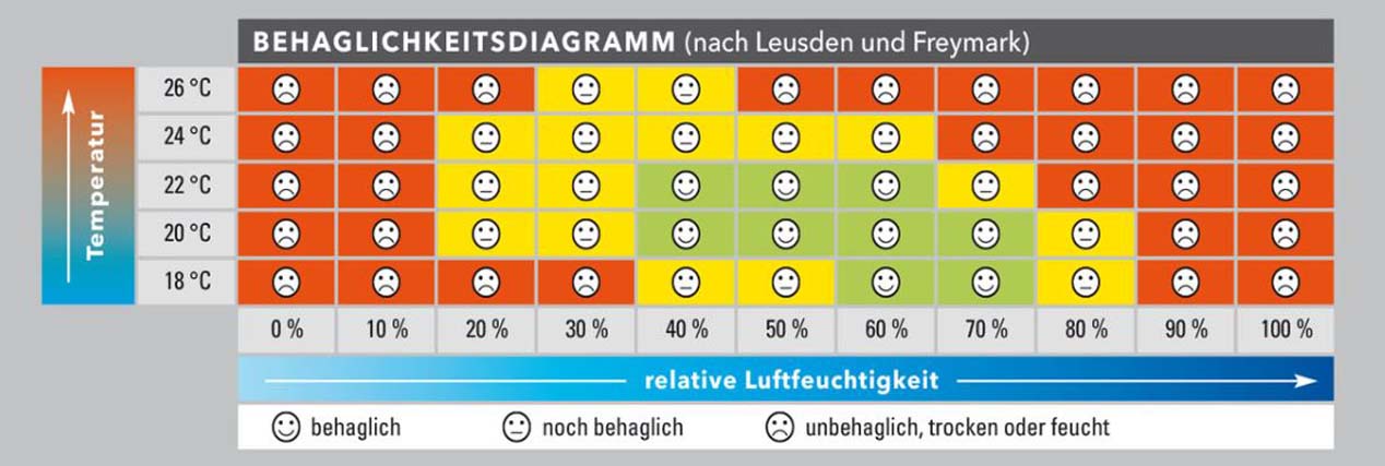 Wie im hier dargestellten Behaglichkeitsdiagramm (nach Leusden und Freymark) gut zu sehen ist, fühlen wir uns innerhalb eines Klimakorridors von 20 bis 22 °C bei 40 bis 60 % relativer Luftfeuchtigkeit am wohlsten.