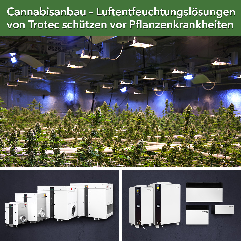 Die Entfeuchtungstechnik von Trotec ist so vielseitig, dass maßgeschneidert für jeden Anbauraum, jedes Aufzuchtareal und jedes Gewächshaus die perfekten Luftfeuchteverhältnisse geschaffen werden können. Für kleine Anbauflächen empfehlen sich die mobilen Kondensations-Luftentfeuchter mit einer Leistung von bis zu 110 l/Tag (850 m3/h), für mittlere Plantagen die flexibel konfigurierbaren DH-Industrietrockner mit einer Entfeuchtungsleistung von bis zu 500 l/Tag (4.600 m3/h) und für große Cannabis-Farmen sind die Trocknungsaggregate der TTR-Serie mit einer Entfeuchtungsleistung von bis zu 1.790 l/Tag (14.700 m3/h) eine ausgezeichnete Wahl.