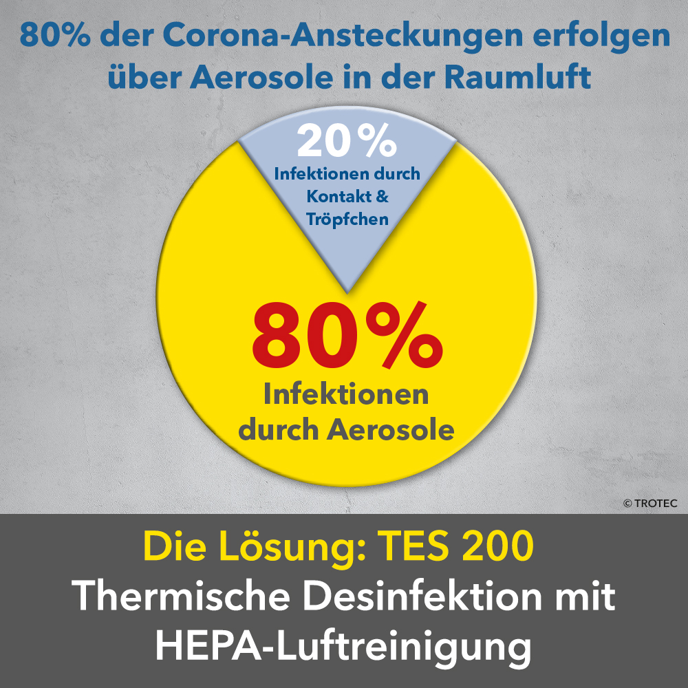 Konzipiert, hergestellt und in verschiedenen Studien getestet wurde der TES 200 in Heinsberg – unmittelbar nach dem Bekanntwerden der ersten Corona-Infektionsfälle in Deutschland. Das oberste Ziel der Trotec-Ingenieure lautete: ein möglichst multifunktionales Gerät zur Bekämpfung des neuartigen Coronavirus zu entwickeln. In Kombination mit einem exklusiv von Trotec hergestellten H14-HEPA-Virenfilter eignet sich der TES 200 neben der Thermodesinfektion ebenso zur effektiven Reinhaltung der Raum- und Atemluft.