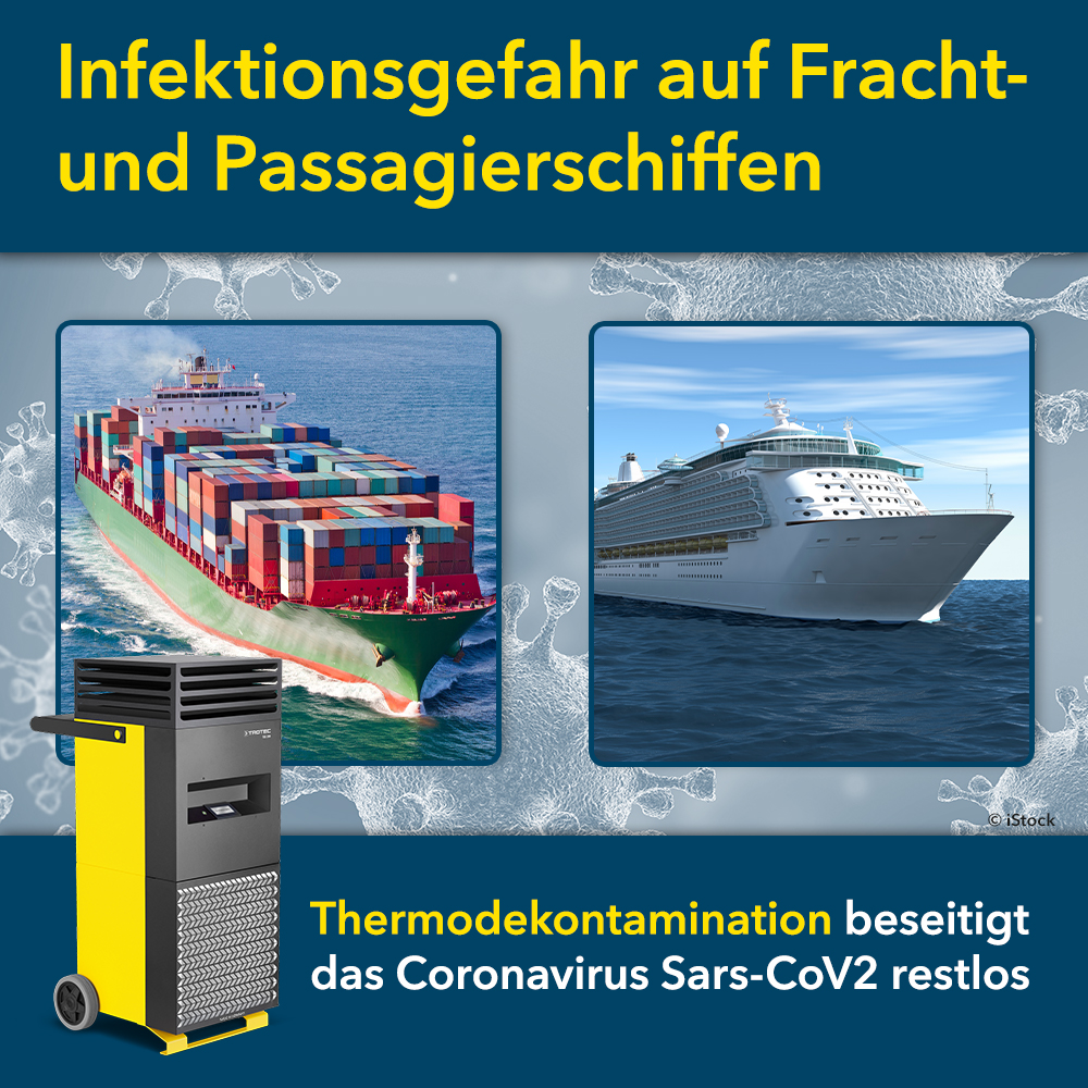 Ein kombinierter Schutz vor kontaminierten Oberflächen sowie infektiösen Aerosolen in der Raumluft wurde nun in Heinsberg entwickelt und im Rahmen verschiedener Studien getestet. Der neuartige Thermodesinfektor TES 200 mit HEPA-Virenfilterung ermöglicht insbesondere auf Fracht- und Passagierschiffen eine unkomplizierte und lückenlose Oberflächendesinfektion aller im Raum vorhandenen Flächen. Zudem verfügt das mobile einsetzbare Gerät über eine integrierte Hochfrequenz-Luftreinigung mit spezieller H14-HEPA-Filterung, um infektiöse Aerosole aus der Raumluft zu filtern – bevor diese unbemerkt eingeatmet werden. Denn auch in einem weiteren Punkt sind sich die Wissenschaftler und Virologen einig. Das Coronavirus überträgt sich neben der Tröpfchen- und Schmierinfektion ebenso über die eingeatmete Raumluft. Genauer gesagt durch sogenannte Aerosole, einem Gemisch aus Gas (in aller Regel Luft) und festen oder flüssigen Bestandteilen, die bei erkrankten Personen Viren enthalten. Diese winzig kleinen Schwebeteilchen werden vorwiegend beim Atmen und Sprechen in den Raum freigesetzt. Während größere Tröpfchen aufgrund ihres Gewichts bereits nach ca. 1,5 Metern zu Boden sinken (daher die Abstandsregel von 1,5 m) schweben Aerosolteilchen aufgrund ihrer geringen Größe (ca. 0,3 – 0,4 µm) bis zu mehrere Stunden in der Raumluft. Erschwerend hinzu kommt, dass bei infizierten Personen in der Lunge noch mehr Aerosolteilchen erzeugt und über die Atmung freigesetzt werden.