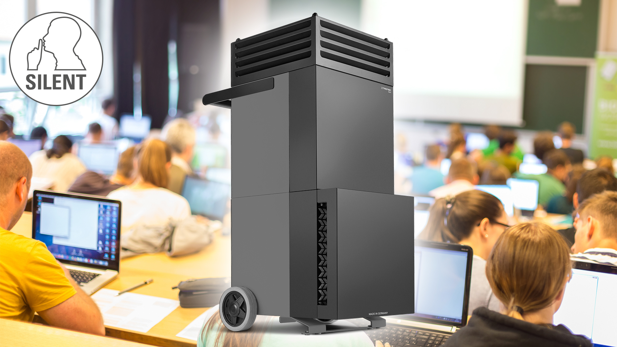 3. Der Luftreiniger muss hinreichend geräuscharm sein, damit er im Betrieb bzw. Unterricht nicht stört. Denn stört der Lärm, dann besteht die Gefahr, dass das Gerät entweder abgeschaltet oder nicht mit dem erforderlichen Volumenstrom betrieben wird. Eine hohe Sicherheit vor einer indirekten SARS-CoV-2 Infektion ist dann nicht mehr gegeben. Daher verfügt der Hochleistungsluftreiniger TAC V+ über eine geräuschdämmende Schallschutzhaube, die ihn zum leisesten Gerät seiner Leistungsklasse macht.