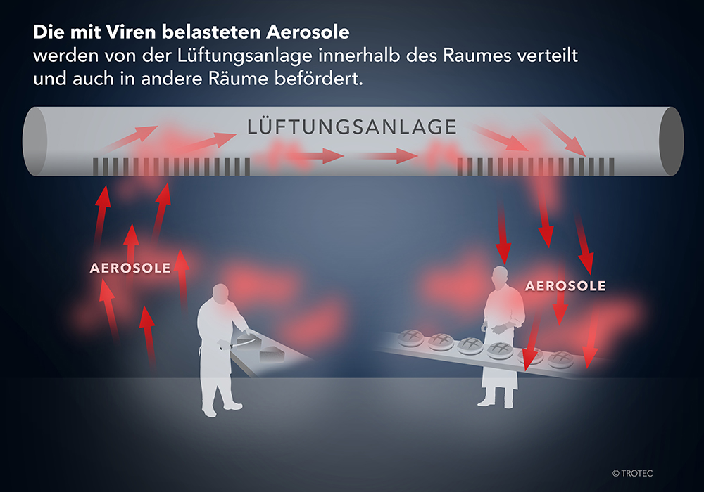 Genauer gesagt durch sogenannte Aerosole, ein Gemisch aus Gas (in aller Regel Luft) und festen oder flüssigen Bestandteilen, die bei erkrankten Personen Viren enthalten. Diese winzig kleinen Schwebeteilchen werden beim Atmen und Sprechen in den Raum freigesetzt. Während größere Tröpfchen aufgrund ihres Gewichts bereits nach ca. 1,5 Metern zu Boden sinken (daher die Abstandsregel von 1,5 m), schweben mitunter infektiöse Aerosolteilchen aufgrund ihrer geringen Größe (ca. 0,3-0,4 µm) bis zu mehrere Stunden in der Raumluft und werden durch die Lüftungsanlage permanent im Raum bewegt – und fortlaufend eingeatmet! Ein Infektionsrisiko, das nach Meinung von Prof. Martin Exner, Direktor des Instituts für Hygiene und öffentliche Gesundheit der Universität in Bonn, bislang nicht in der ausreichenden Tiefe wissenschaftlich diskutiert wurde.