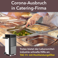 „Was bislang nicht bekannt ist: Umluft kann ein Aerosol in Bewegung halten. Das ist ein bislang übersehener Risikofaktor.“ Herkömmliche RLT-Anlagen verfügten nur über eine Grobfiltration, die nicht in der Lage sei, luftgetragene Viren auszufiltern, so Prof. Exner in der Analyse des Infektionsgeschehens bei Tönnies. Helfen soll die neuartige Luftreinigungstechnik TAC V+ von Trotec, deren mobile und dezentral einsetzbare Hochleistungsfiltration dafür sorgt, dass die keimbelastete Raumluft in der Produktion von luftgetragenen Mikroorganismen wie dem SARS-CoV-2-Virus befreit wird. Der von Trotec entwickelte Heat-Resistant HEPA-Hochleistungsfilter der Filterklasse 14 wird zudem thermisch aufbereitet, sodass Viren nicht nur aus der Luft abgeschieden, sondern zusätzlich im Gerät inaktiviert werden.