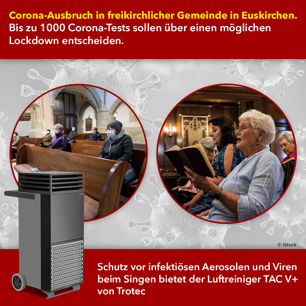 Eine wirksame Lösung, um die Aerosolbelastung während des Gottesdienstes zu minimieren und so auch weiterhin den gemeinsamen Gesang zu ermöglichen, hat Trotec mit dem neuartigen Luftreiniger TAC V+ entwickelt. Dieser mobile Luftreiniger reduziert nicht nur die gefährliche Aerosolbelastung in der Raumluft. Etwaige Viren werden zusätzlich mit einer Filtereffizienz von 99,995 % im ebenfalls von Trotec entwickelten HEPA-Heat-Resistent-Hochleistungsfilter abgeschieden und abgetötet.
