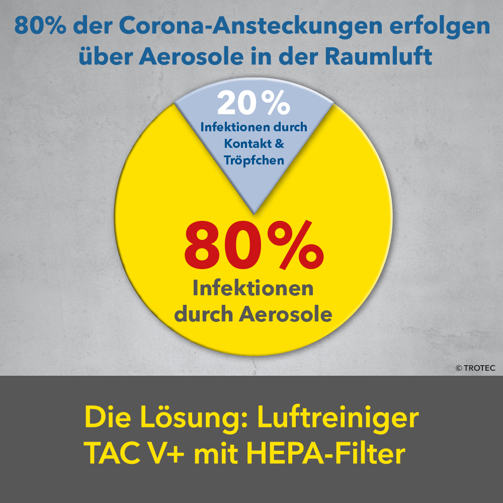- Durch den Einsatz eines geeigneten Luftreinigers. Mit dem in einer Heinsberger Studie getesteten TAC V+ werden Aerosolgemische in der Raumluft unmittelbar nach der Freisetzung verdünnt und danach in einem speziellen HEPA-Virenfilter ausgefiltert und inaktiviert.