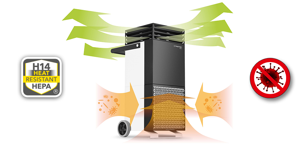 - Des Weiteren werden luftgetragene Viren und Bakterien in einem neuartigen, hitzebeständigen HEPA-Schwebstofffilter zuerst abgeschieden und dann zyklisch, durch thermische Dekontamination, abgetötet. Dieser exklusiv von Trotec entwickelte Spezialfilter der Schutzklasse 14 zeichnet sich durch einen Abscheidegrad von 99,995 Prozent bei Partikelgrößen von 0,1 bis 0,2 µm aus. Dank dieser Eigenschaften werden H14-Hochleistungsfilter selbst in Operationssälen zur Reinluftherstellung sowie in vergleichbar hygienesensiblen Bereichen eingesetzt