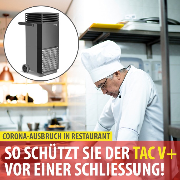 Wie wichtig eine dauerhafte Luftreinigung in Restaurants ist, zeigt der erste Corona-Ausbruch bereits kurz nach der Wiedereröffnung vieler Restaurants. Nur eine permanente Viren-Luftreinigung schützt vor der Einatmung virenbehafteter Aerosole, die beim Sprechen in den Raum ausgestoßen werden und bis zu Stunden in der Luft verbleiben. Der neuartige Hochfrequenz-Luftreiniger TAC V+ von Trotec komplettiert lückenhafte Hygienekonzepte um einen wirksamen Schutz vor der Ansteckungsgefahr über die Raumluft. Der Luftreiniger filtert infektiöse Aerosole schnell und effektiv aus der Raumluft – bevor diese von Mitarbeitern oder Kunden eingeatmet werden.