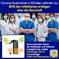 - Durch den Einsatz eines geeigneten Luftreinigers. Mit dem einem geeigneten Luftreiniger werden Aerosolgemische in der Raumluft unmittelbar nach der Freisetzung verdünnt und danach in einem speziellen HEPA-Virenfilter ausgefiltert und inaktiviert.