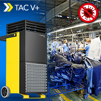 Die Gefahr, sich bei Einhaltung der Abstandsregeln dennoch über die Raumluft mit dem Coronavirus zu infizieren, sinkt durch den Einsatz eines Trotec-Luftreinigers TAC V+ mit Virenfilter signifikant! Ganz gleich, ob in der Produktion, in der Weiterverarbeitung oder in der Endverarbeitung sowie Verpackung der Schutzausrüstung – nahezu überall lassen sich durch den Einsatz des TAC V+ infektiöse Aerosolwolken in Sekundenschnelle aus der Raumluft filtern. Wo der mobile Luftreiniger TAC V+ platziert wird, schafft er saubere und virengefilterte „Clean-Air-Zones“. In diesen Zonen bleibt die Umgebungsluft weitgehend frei von luftgetragenen Keimen und Viren, denn der TAC V+ saugt die belastete Raumluft in Bodennähe an und reinigt diese mit einer effektiven HEPA-Virenfilterung.
