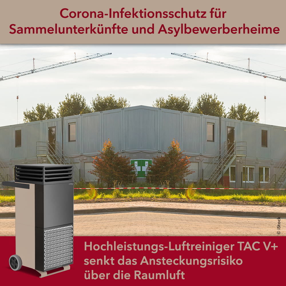 Der Hochleistungsluftreiniger TAC V+ ergänzt lückenhafte Hygienekonzepte und sorgt für eine sichere und virenfreie Raum- und Atemluft in Sammelunterkünften.