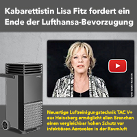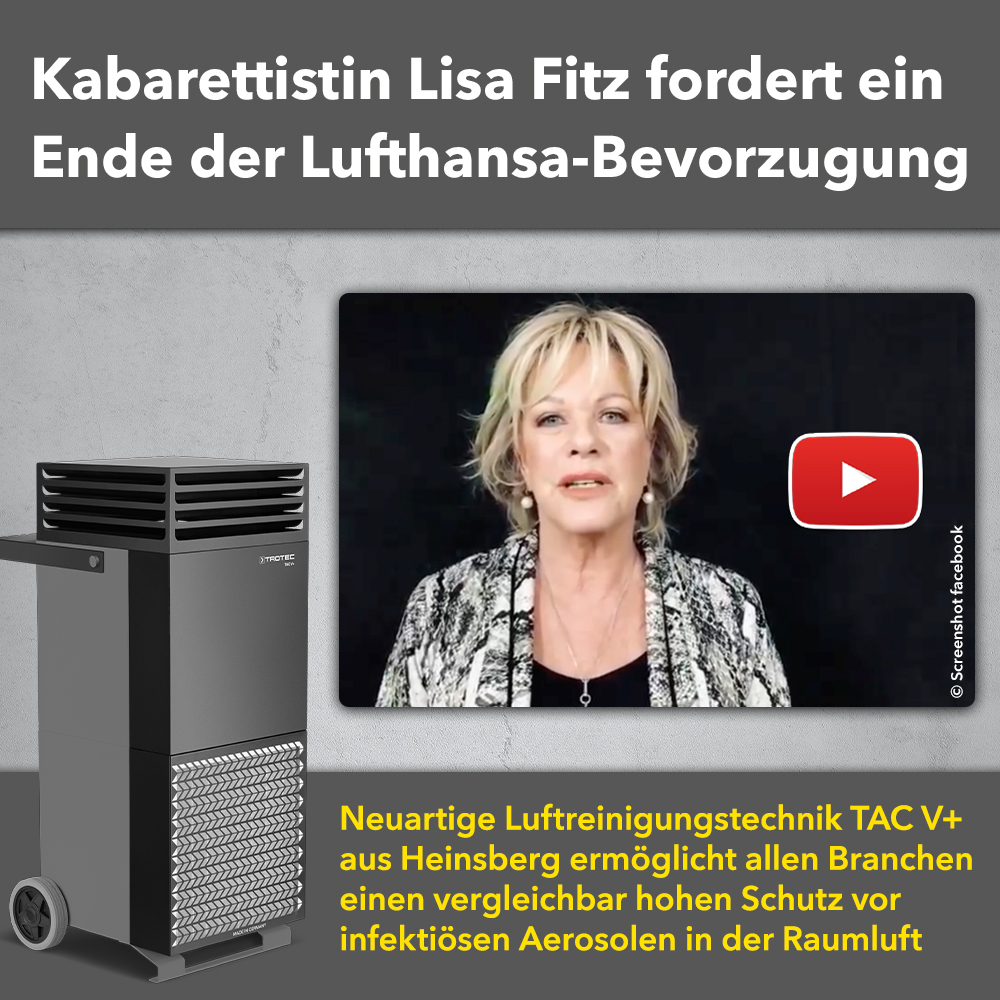 Zahlreiche Studien belegen den hohen Wirkungsgrad des neuartigen Luftreinigers TAC V+, der die Raumluft nach dem nahezu identischen Prinzip von Viren befreit, wie es die Lufthansa in ihren Flugzeugen umsetzt. Einziger Unterschied. Der TAC V+ ist eine mobile Lösung, die je nach Raumgröße beliebig skaliert werden kann. Und dennoch müssen sich Unternehmen, die diesen Luftreiniger bereits zum Schutz ihrer Mitarbeiter und Kunden einsetzen, weiterhin an die vorgeschriebenen Abstandsregeln und behördlichen Auflagen halten. Mit teils verheerenden wirtschaftlichen Folgen. In Restaurants bleiben Tische leer, in den Hotels die Betten und auch in Kunst und Kultur herrscht gähnende Leere in den Zuschauerreihen. Diese Ungleichbehandlung bei den Corona-Virus-Bestimmungen hat nun auch die Kabarettistin Lisa Fritz zu einem emotionalen Statement veranlasst. In einem Video fragt sie zu Recht, warum die Lufthansa quasi einen Freibrief zur Maximalauslastung ihrer Flugzeuge erhält, alle anderen Bereiche der Wirtschaft aber trotz gleichwertiger Schutzmaßnahmen nach wie vor gegängelt werden.