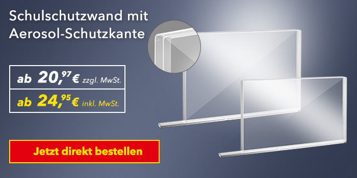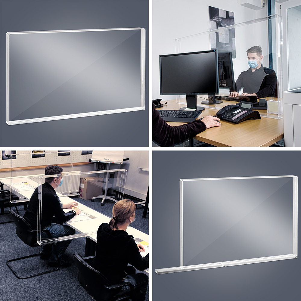 Überall dort, wo Menschen auf engstem Raum miteinander arbeiten und ein Mindestabstand von 1,50 m nicht eingehalten werden kann, bieten transparente Acryglasplatten-Schutzwände mit Aerosol-Schutzkante einen beidseitig hohen Schutz vor der respiratorischen Aufnahme infektiöser Krankheitserreger.