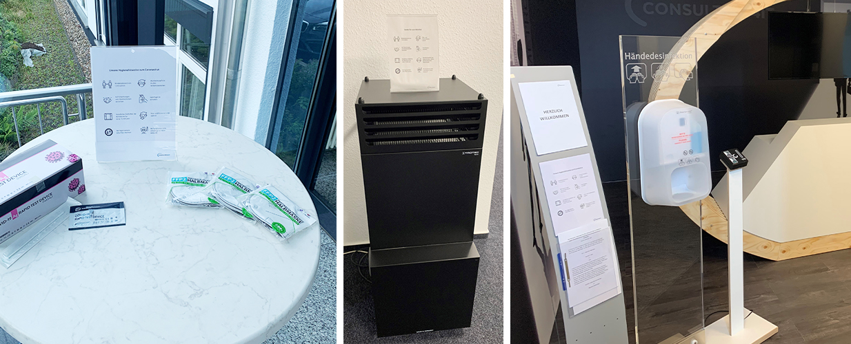 Bereits zu Beginn der Corona-Pandemie Anfang 2020 erfolgten Investitionen in Präventionstechniken wie mobile TAC V+ Hochleistungsluftreiniger, Zutrittskontrollen mit Fiebermess- und Desinfektionsstationen und Masken – natürlich kostenfrei für alle Mitarbeiter in beliebiger Menge. Raumbelegungskonzepte sorgen für Kontaktminimierungen, Gemeinschafts- und Besprechungsräume sind mit mobilen Luftreinigern von Trotec ausgestattet, um das indirekte Ansteckungsrisiko auf ein Mindestmaß zu reduzieren.