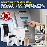 Zum Kauf oder zur Miete – bei uns finden Sie die passgenauen Luftbefeuchter und/oder Aircooler, mit denen Sie die Kundenzonen Ihrer Bank- oder Sparkassen-Filiale ausstatten können. Ebenfalls werden Sie bei uns mit Sicherheit auch für Ihren persönlichen Bedarf fündig. Überzeugen Sie sich selbst und profitieren Sie zudem von dem unschlagbaren Preis-Leistungs-Verhältnis eines führenden Markenanbieters bei unseren: