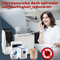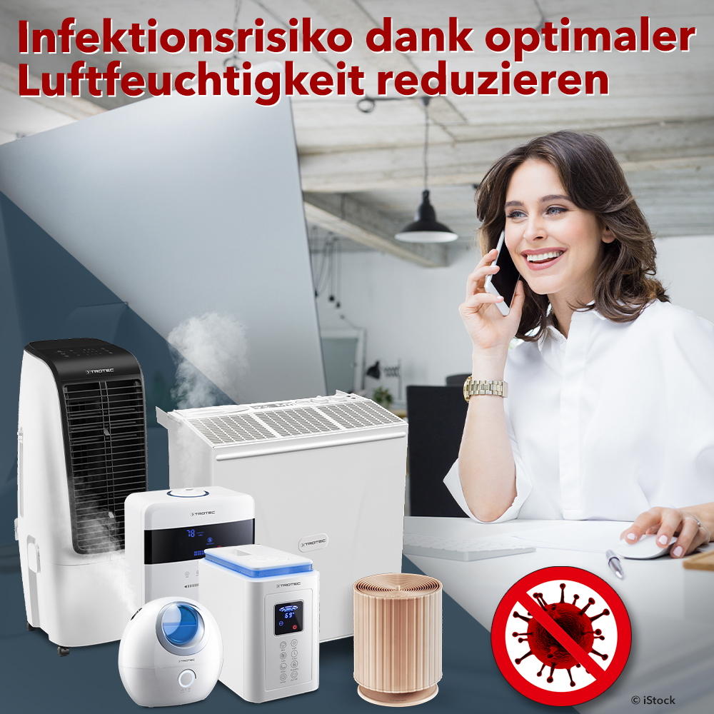 Auch Fachärzte betonen, dass wir das Infektionsrisiko über die Anhebung der Luftfeuchtigkeit in Gebäuden mindern können. So führt die Steigerung der Luftfeuchte durch Befeuchtung auf rund 50 % zu einer Reduktion des Übertragungsrisikos. Luftbefeuchter und Luftkühler von Trotec schaffen hier Abhilfe. Die hygrostatgesteuerten Trotec-Luftbefeuchter der B-E- und B-Serie sorgen für eine optimal regulierte Luftfeuchte und gereinigte Raumluft. Und die Luftkühler der PAE-Serie befeuchten die Luft nicht nur, sondern bringen jetzt im Sommer erfrischende Verdunstungskühle ins Haus.