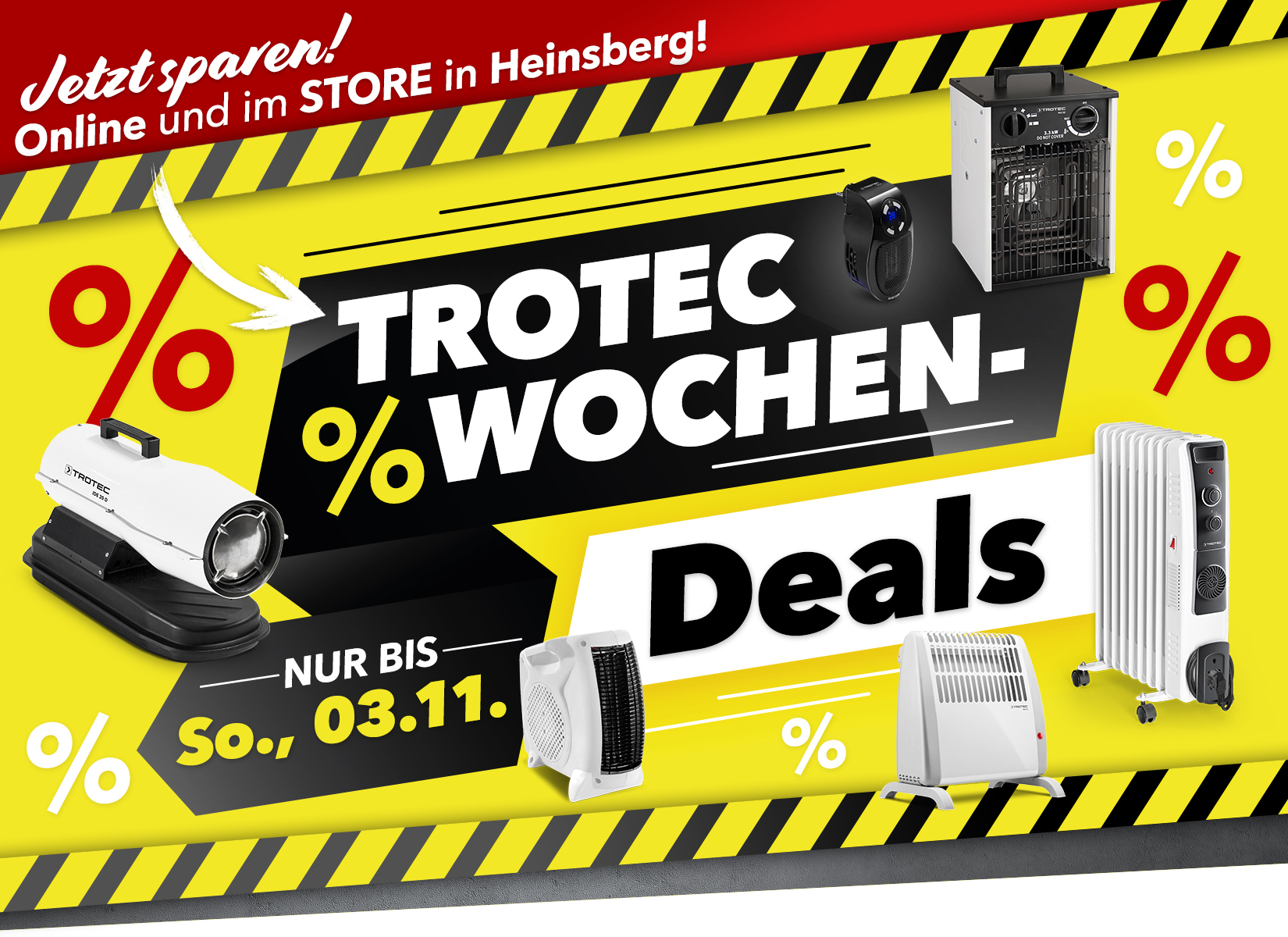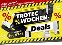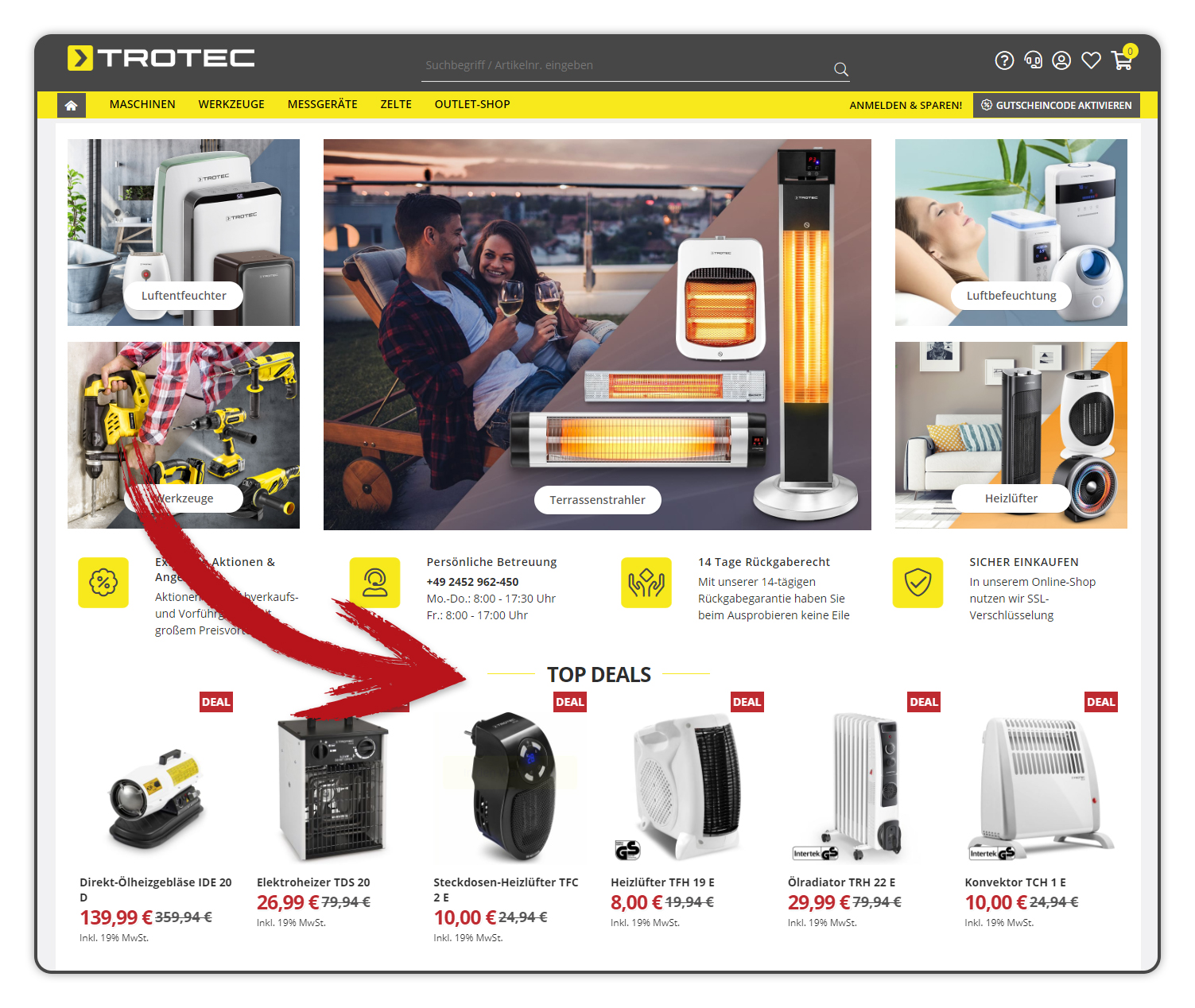SO FINDEN SIE IHRE DEALS IM ONLINE-SHOP:Auf unserer Startseite im Online-Shop de.trotec.com/shop werden Ihnen alle „TOP DEALS“ angezeigt. Navigieren Sie einfach mit den Pfeilen nach „rechts“ und „links“ und Sie finden alle aktuellen Deals. |