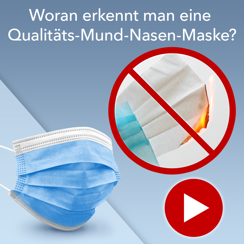 Die Feuerprobe für qualitativ hochwertige Mund-Nasen-Masken ist der Feuertest. Das für Masken verwendete Vlies ist nicht entflammbar! Halten Sie ein Feuerzeug oder eine Kerze unter das Filtervlies, dürfte dieses kein Feuer fangen, sondern nur schmelzen. Brennt die Maske hingegen nach dem Wegnehmen der Flamme selbständig weiter wie einfaches Papier, dann können Sie davon ausgehen, dass in der Produktion auch nur unwirksamer Schrott statt hochwertigem Filtervlies verwendet wurde!