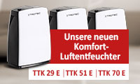 Der TTK 29 E hält mit einer Entfeuchtungsleistung von bis zu 10 Litern pro Tag kleine, beheizte Räume bis zu 15 m² zuverlässig trocken. Der Luftentfeuchter TTK 51 E entzieht der Umgebungsluft bis zu 16 Liter Feuchtigkeit pro Tag und ist für Raumgrößen bis 31 m² geeignet. Schließlich der Luftentfeuchter TTK 70 E: er verfügt über eine maximale Entfeuchtungsleistung von 20 Litern pro Tag und eignet sich hervorragend für Raumgrößen bis 45 m².