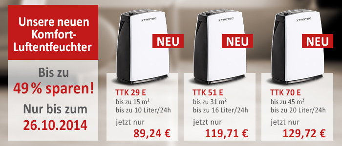 Trotec ist im Markt für Komfort-Luftentfeuchter unangefochten die Nummer 1. Mit der weltweit größten Auswahl an Luftentfeuchtern haben wir für jeden Bedarf und Geschmack immer ein passendes Modell. Ob Haushalt oder Büro, kleine oder große Räume, stets finden Sie bei uns genau die passende Entfeuchterleistung – bestes Beispiel sind unsere drei neuen Entfeuchter. Bei jedem dieser Geräte profitieren Sie vom ausgezeichneten Preis-Leistungsverhältnis des Marktführers. Und dank unseres Warte-Rabatts sind sie aktuell ganz besonders günstig. Also, gleich bestellen und sofort sparen. Ausgeliefert wird in KW 43!