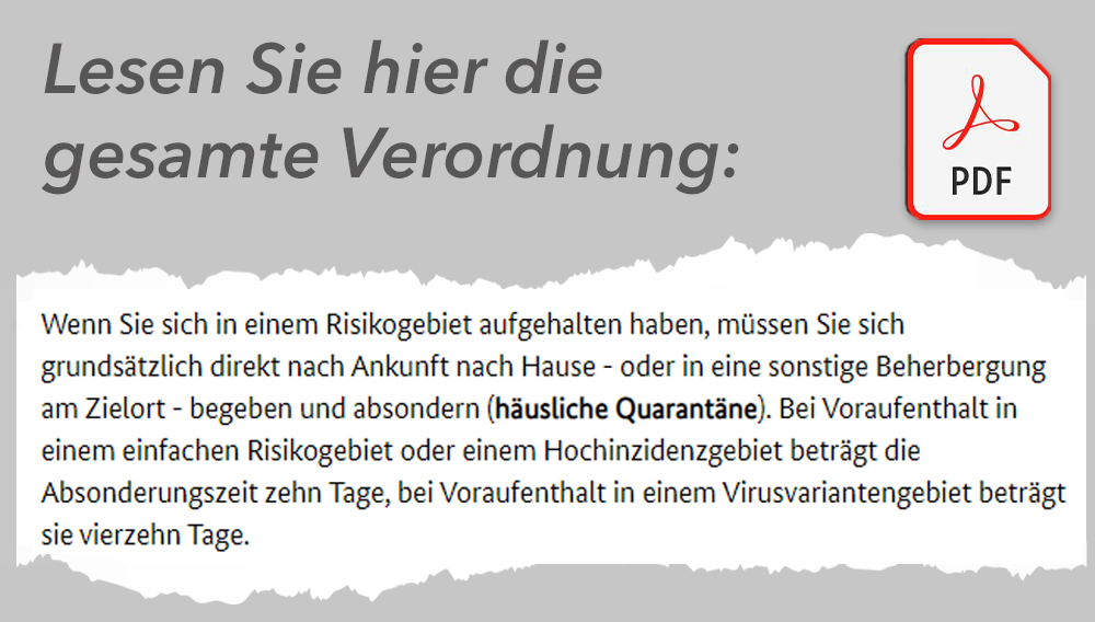 „Wenn Sie sich in einem Risikogebiet aufgehalten haben, müssen Sie sich grundsätzlich direkt nach Ankunft nach Hause – oder in eine sonstige Beherbergung am Zielort – begeben und absondern (häusliche Quarantäne). Bei Voraufenthalt in einem einfachen Risikogebiet oder einem Hochinzidenzgebiet beträgt die Absonderungszeit zehn Tage, bei Voraufenthalt in einem Virusvariantengebiet beträgt sie vierzehn Tage.“