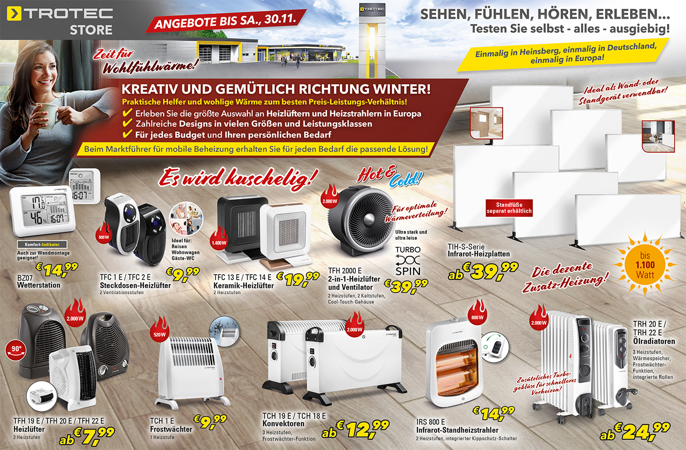 *Die Artikel liegen in begrenzter Menge vor und können daher bereits am ersten Aktionstag ausverkauft sein. Abgabe nur an Endverbraucher in haushaltsüblichen Mengen. Die Aktions-Preise sind exklusiv nur bis Sa., 30.11. bei Trotec vor Ort in Heinsberg gültig. Alle Preise inkl. MwSt. Für Schreibfehler keine Haftung.