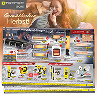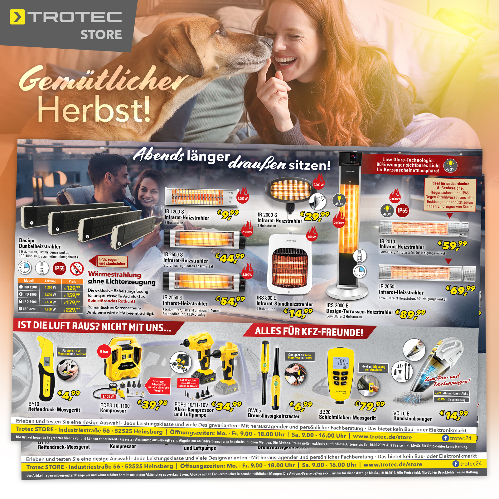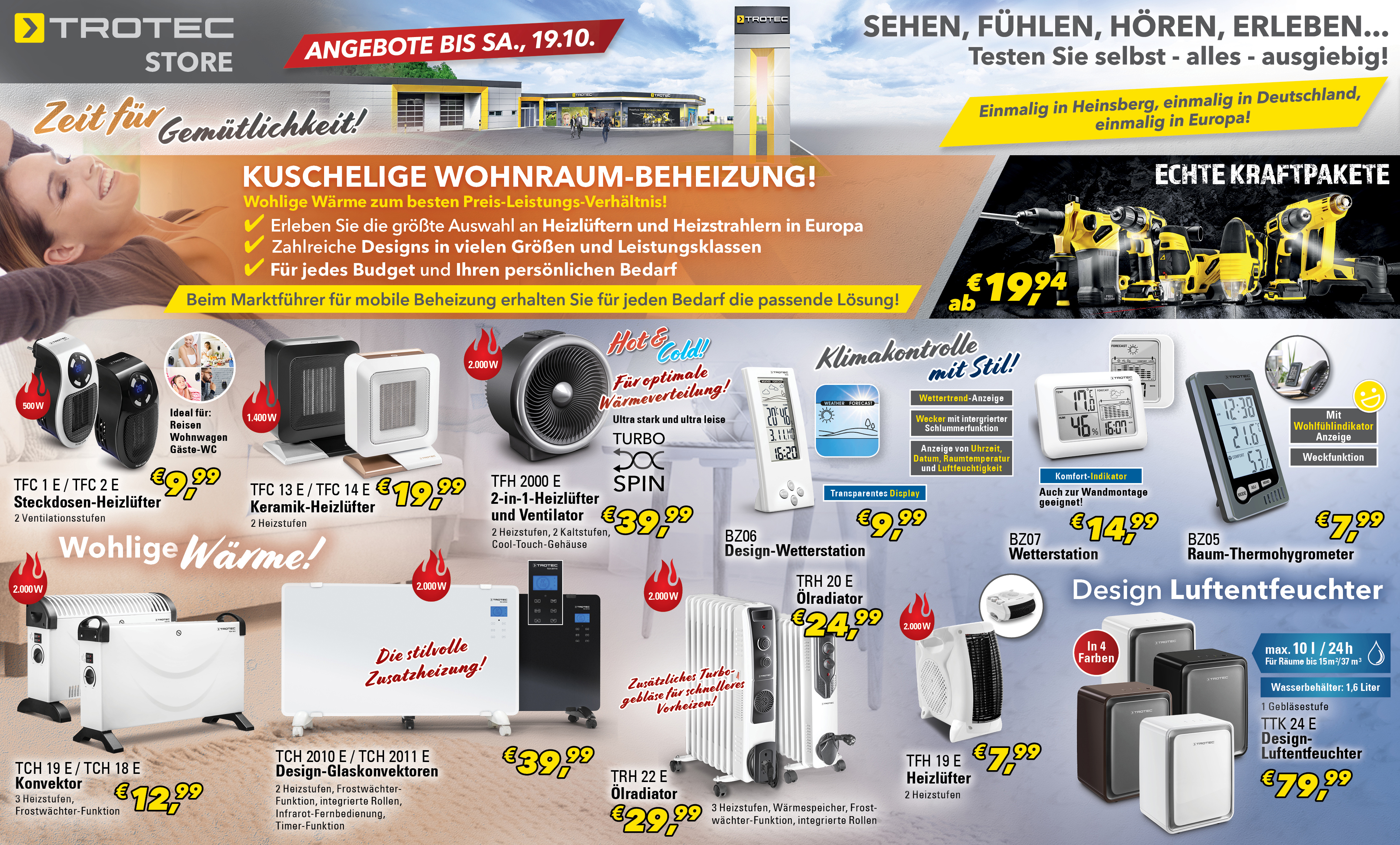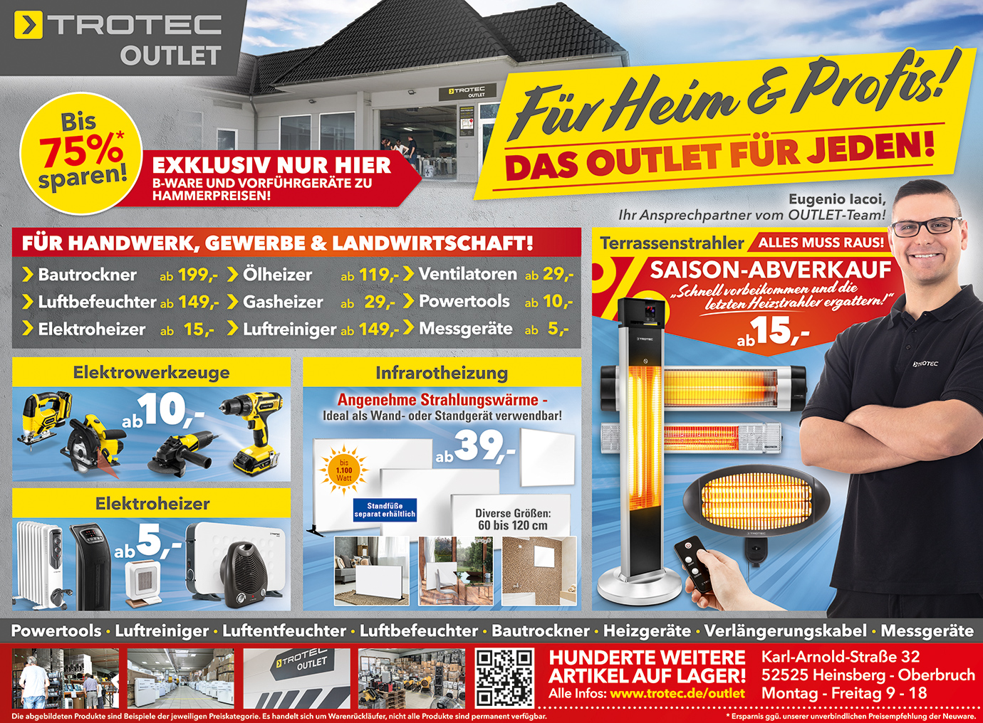 *Die Artikel liegen in begrenzter Menge vor und können daher bereits am ersten Aktionstag ausverkauft sein. Abgabe nur an Endverbraucher in haushaltsüblichen Mengen. Die Aktions-Preise sind exklusiv nur bis Sa., 19.10. bei Trotec vor Ort in Heinsberg gültig. Alle Preise inkl. MwSt. Für Schreibfehler keine Haftung.